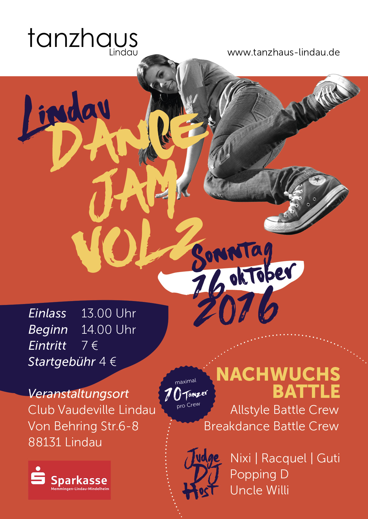 Am Sonntag 16. Oktober 2016 ist es soweit… ….das tanzhaus Lindau veranstaltet die LINDAU DANCE JAM VOL 2 im Club Vaudeville. Wir freuen uns auf alle Tänzerinnen und Tänzer die mitmachen und auch auf zahlreiche Zuschauerinnen und Zuschauer!