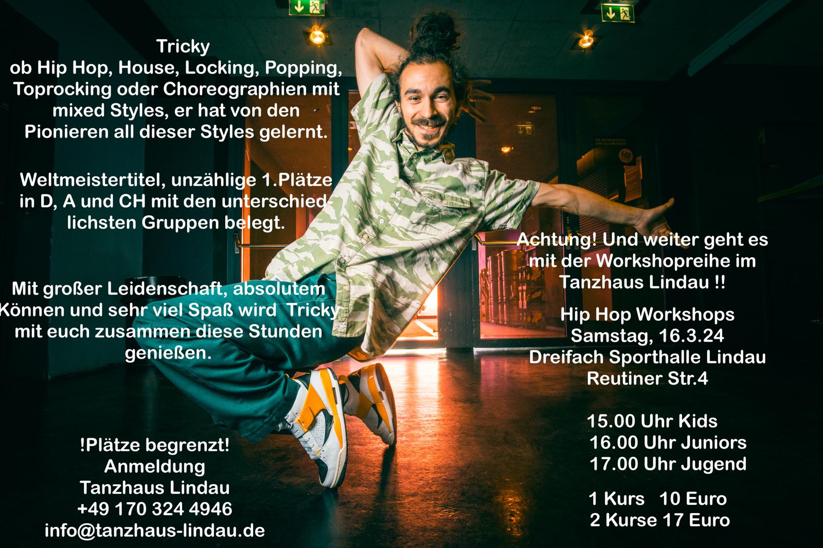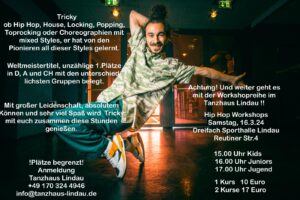 Workshop am 16.3. Tricky : Kids, Juniors, Jugend Veröffentlicht am 14. Februar 202414. Februar 2024 von web578 unsere Workshopreihe geht weiter….. HipHop, House, Locking……..mit TRICKY SAMSTAG,16.03.24 ….um Anmedldung wird gebeten- Achtung- Plätze sind begrenzt!